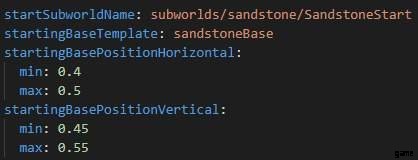 StartingBasePositionHorizontal と startingBasePositionVertical は、開始サブワールド内の開始ベースの位置を決定します。デフォルトではほぼ中心です。