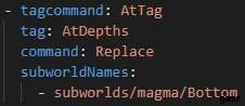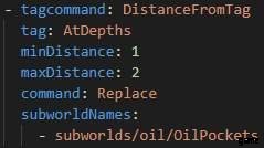 ここで worldgen はマップの下部を基準点として使用し、その点から 1 ~ 2 ブロックの距離に石油のサブワールドを生成します。この時点で、それらの場所で以前に生成されたサブワールドは上書きされます。 AtDepths は、地図の中心や下部の 1 点ではなく、地図の下部全体を指すことに注意してください。