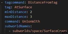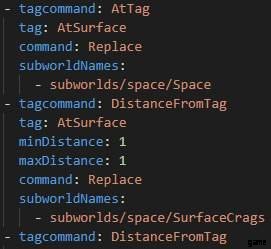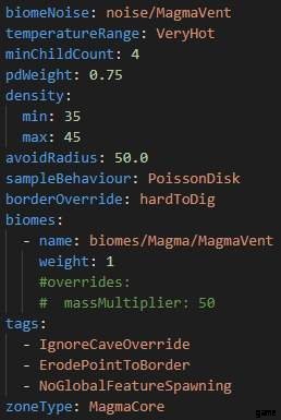 .yaml のこのセクションでは、Volcanea のサブワールドがブロックごとに生成され、中心から外側に向かっています。 Worldgen はこれらを直線的に読み取るため、.yaml で後で生成されたサブワールドは、それらの前に生成されたサブワールドを常にオーバーライドします。
