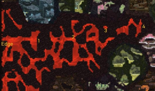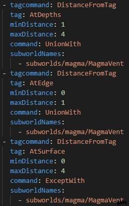 ここで worldgen は、Volcanea で非常に認識可能なマグマ ベントを作成します。 Depths からの 1 ~ 4 の場所の値は、開始場所の境界にマグマ ベントを配置します。この最初の UnionWith は、その範囲内の世界中のどこにでもマグマ ベントを生成しますが、2 番目の UnionWith は、マップの端にマグマ ベントを生成します。 AtEdge は地図の両端を指すことに注意してください。ただし、小惑星は丸いものとして扱われるため、技術的には 1 つの端と見なされます。