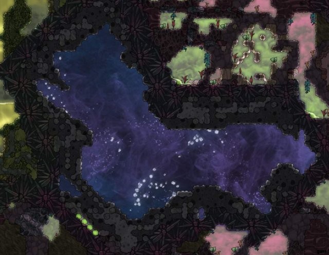 Biomes are the elements that make up the terrain of subworlds. The distribution of solid elements, gases, and liquids are all determined by the subworld’s biome. In default biomes, with the exception of magma and liquid hydrogen and oxygen, liquids are not generated. When generating bodies of water for the player, features are used instead. This is because, unless the liquid occupied the majority of space in the subworld, using biome data to generate water would create rivulets and scattered pockets of it throughout the subworld, which would be disruptive rather than functional.