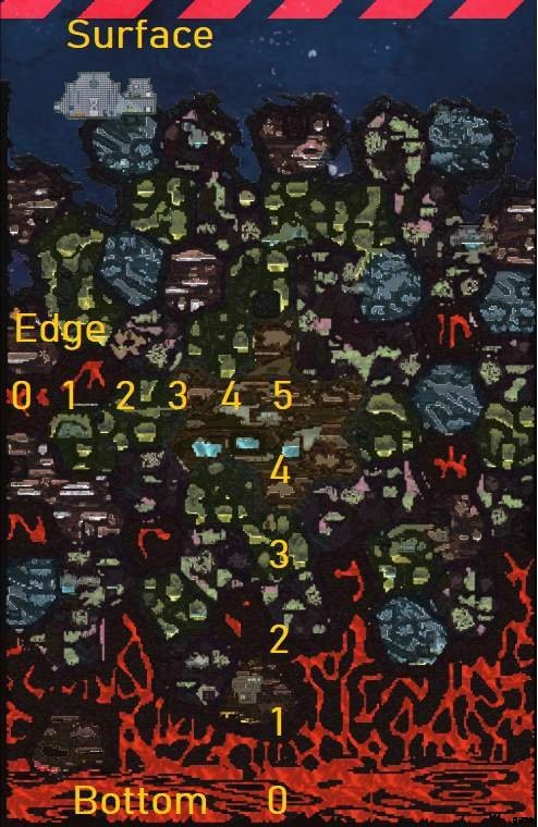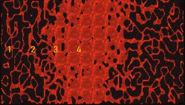 As you can see, 3-3 by no means has 5 parts obsidian to 1 part magma. Since I do not have access to the game code and do not have a background in mathematics, I can only guess at how bandsize is generated through experience and testing in worldgen. At a certain point it becomes intuitive, and I recommend experimenting on your own until you reach that point.