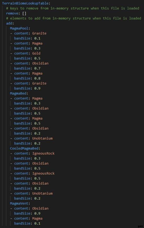 ガイドのこのセクションでは、world .yaml の各部分について説明します。使用例は「worldsVolcanic.yaml」です。 Volcanea は、このガイドの大部分でサンプル ワールドとして使用されます。