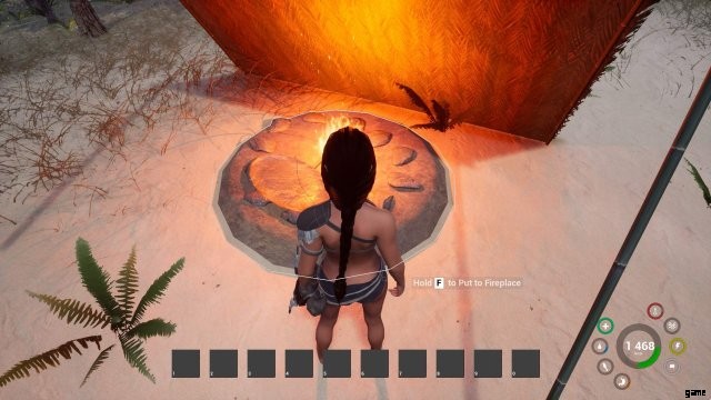 For cooking you need a fireplace with some fuel. Wood will burn for longest time. You can also use bamboo or palm leafs – but they will burn quickly. Also everything must be dry. Put wood into your right hand and highlight the fireplace. A “put in inventory” hint will pop up.