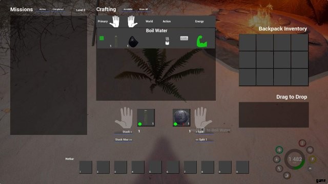 ボトルに水を入れる – ボトルを手元に置き、水源の近くに留まります。 (これは主要なアクションではないため、インベントリ ビューでのみ使用できます)。