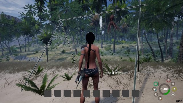 You can dry fish or octopus. They will last longer and not spoil soon. You need to build Construction Step n.3. Then find some lianas. Put fish to left hand and liana to right hand and step close to construction to highlight it. A crafting action to hang fish or octopus will show up.