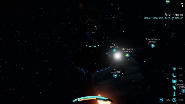 宇宙に入ったら (スロットル設定が 4. 宇宙に変わります)、下に小惑星が見えるまで登り続けます。スペース ジャンクは色が濃く、黒い星空では見つけにくいため、これは重要です。こんな感じです。