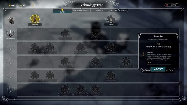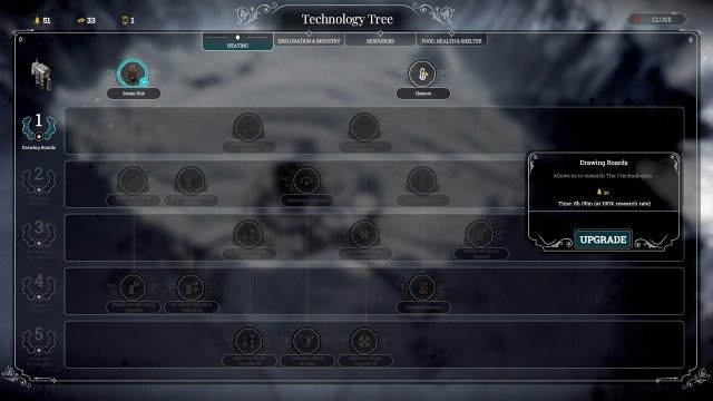 Steamhubs の研究が完了したら、Drawing Boards として知られる技術レベル 1 を取得し、それを取得します。代わりに木材がヒーターを取得していない場合は、どちらを取得しても問題ありません。このビルドでは、どちらの方向にも分岐できます。3 日目には同じ結果になります。