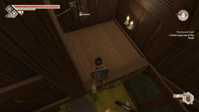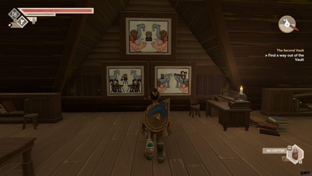 古代の厩舎の 2 階に上がると、この金庫室の最初のパズルに気付くでしょう。さらに進むには、プラットフォームを下げる必要があります。これを行うには、簡単なレバーとその横にある絵があります。