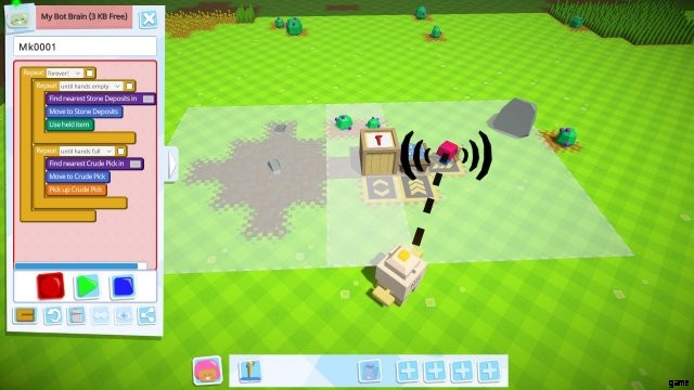 地面から離したい場合は、ツールを手に取ってボットを表示し、その繰り返しをオンにしてから、手がいっぱいになるまで繰り返します。別の繰り返しブラケットに両方の繰り返しセクションを設定し、それを永遠に繰り返し続けます.
