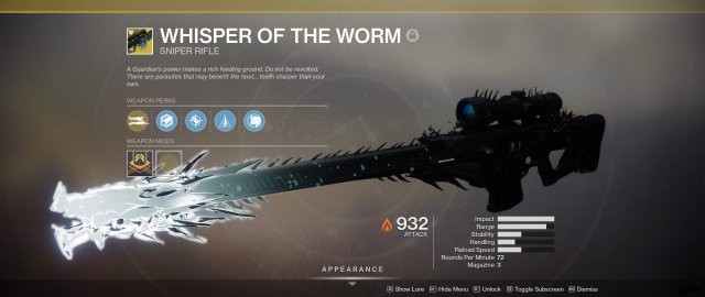 そうでない場合は、これが主なダメージ武器になります:ワームのささやき. 触媒がなくても、この武器はリロードする必要なく非常に多くの DPS を提供するため、ボスやタフな敵に最適です. Whisper を持っていない場合の別の選択肢は D.A.R.C.I. ですが、持続 DPS は低くなります。