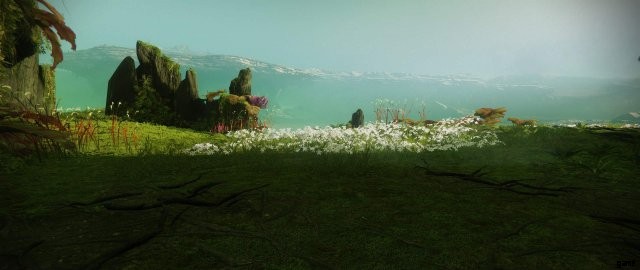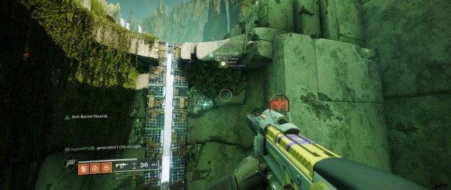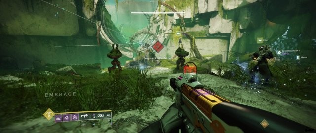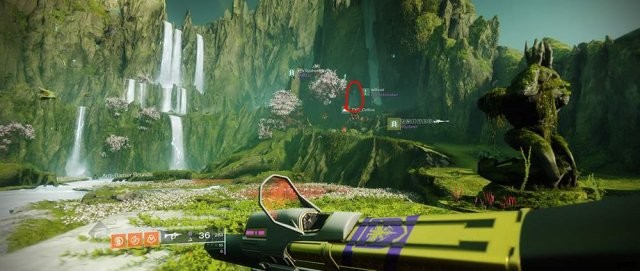 ここでは、ミノタウロスを食べている (???) 巨大なハーピー、3 つのランダムなスポットの 1 つに光る青いボックス、施錠されたゲートの近くにある「プラス」記号のボックスがあります。この青いボックスは、このレイドの定期的な機能であり、それを撃つと「テザリング」できます。テザリングを使用すると、射撃ができなくなり、三人称視点になりますが、近くにいる他のチームメイトにテザリングすることができます。リンクされているチームメイトは青い線で表示されます。距離が離れすぎて壊れそうになると、線が細くなり、最終的には赤くなります。視線が途切れるとテザリングも中断されるため、テザリング中は常にチームメイトの視界に入るようにしてください!