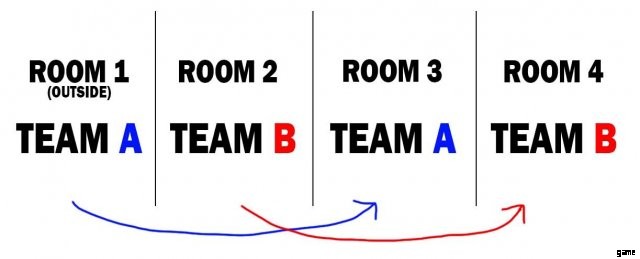 そのスキームに従えば、ほとんどの遭遇を乗り越えることができますが、いくつかの詳細について話します.最初の部屋では、最初に過大請求された人がそこから飛び出して、広告で「行く」チームを助けに行く必要があります.問題に遭遇する。最後に残った人が広告に圧倒される可能性があるため、2 人目の人は立ち去るべきではありません。