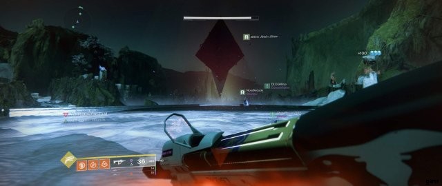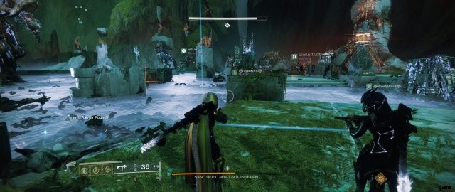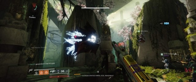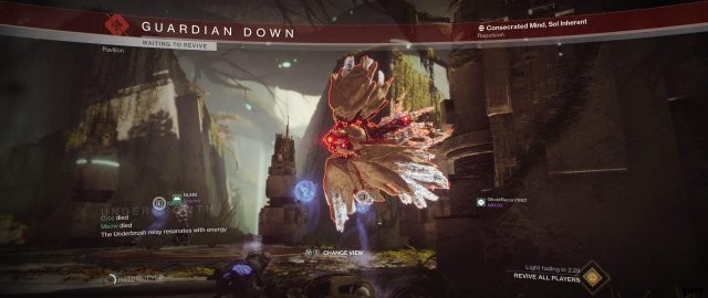 30 個のモートが配置されると、メッセージがポップアップ表示され、マインドがモートの合流点に移動し始めます。そこにいるとき、あなたを撃つもの(上に見られるように)を含むすべての目が点灯し、それらをすべて撃ち落とすか、あなたが拭きます.それが完了すると、その頭は巨大な白いクリティカル スポット クリスタルに変わり、ボスは逃げ始めます。マインドに従って、そこにあるすべてを解き放ち、チームに戻ります。コンサクラテッド マインドが死ぬまで、洗い流して繰り返します。