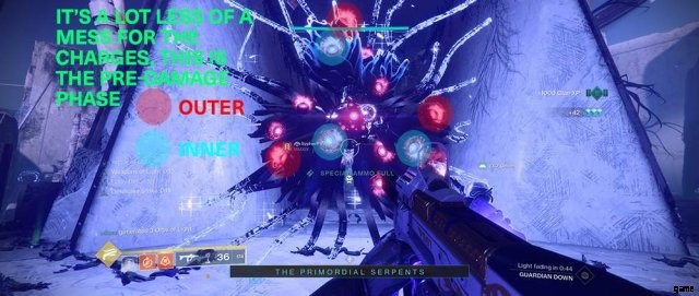 First, divide your fireteam into 3 teams of 2. Team 1, Team 2 and Builders, and assign each of them to a side; it’ll be important later. You’ll be doing two 15 15 runs:Team 1 will jump in first, get their motes, and come back. At the same time that they come back, Team 2 will go in while builders are at work rebuilding all of the lost platforms. After Team 2 is back, the shoulder weakspot should be broken and Team 1 will go into the portal, etc.
