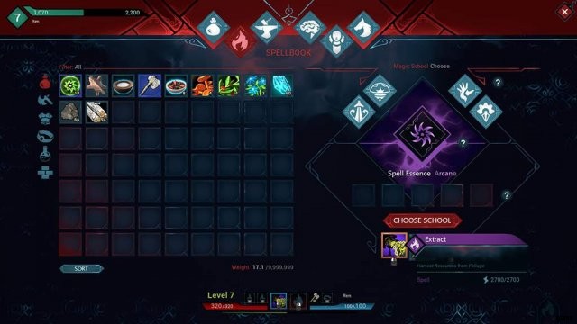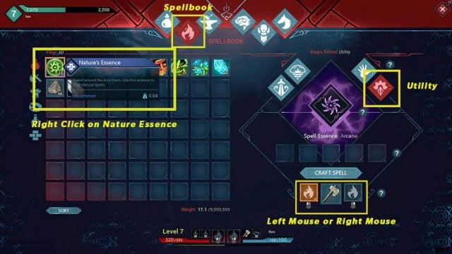 下のこの画像で自分自身を理解してください。左上隅には、斧を使用して収集した新しく収穫した自然のエッセンス、呪文学校 – ユーティリティ、および呪文をバインドする武器 (この場合はストーンヘッドアックス) が含まれています