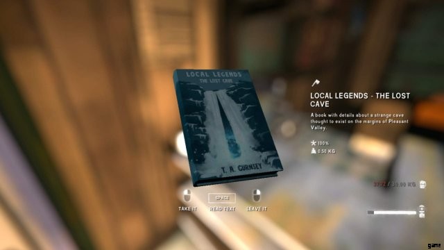 本は、カウンター棚の公民館から道路の反対側にある家(サバイバルモードのRural Store)にあります。飛行機の墜落現場からそう遠くないミスティ フォールズ ピクニック エリアのそばにある洞窟へと続いています。ランタンを持ってこの洞窟を探索してください。氷の壁を通り抜けたらアダムに行くことをお勧めします。