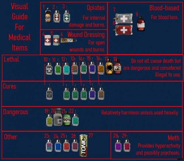 さらに深く掘り下げる前に、基本的な情報から始めます。このガイドを読むことを強くお勧めします。なぜなら、もしあなたが薬をよく理解していなければ、おそらく最終的に自分自身を ♥♥♥ やめてしまうからです.ハロウィーンの更新のおかげで、最も一般的な死因はアヘン剤の過剰摂取になりました.誰か/何かが被る可能性のある損傷と苦痛にはいくつかの種類があります。詳細に入ることなく、考えられるすべての苦痛とその治療法についてお知らせします.治療オプションには、最も推奨されるものから最も推奨されないものの順に下線が引かれます。また、「アヘン剤」と言うときは、アヘン、モルヒネ、フェンタニルを指していることを忘れないでください.モルヒネとフェンタニルはアヘンの高度な形態です。