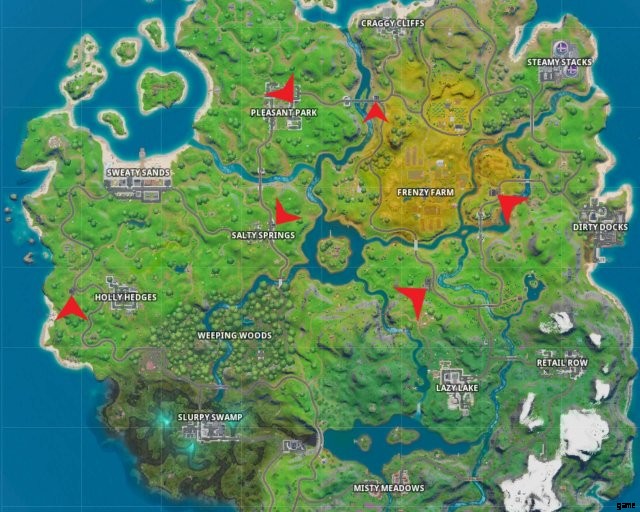 上の地図で見つけることができたすべてのフォートナイトガスポンプの場所を見ることができます.対戦相手にダメージを与える最善の方法は、ガソリン スタンドにいる対戦相手に忍び寄ってポンプを爆破しようとするか、ガソリン スタンドに誘い込んでポンプを爆破させることです。