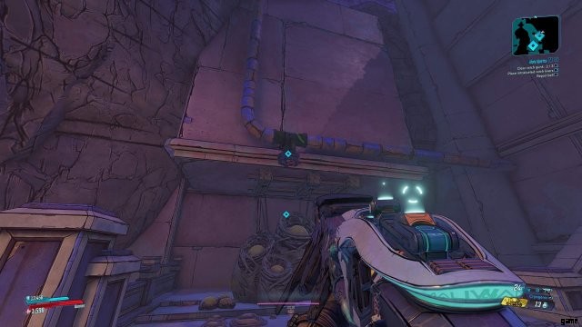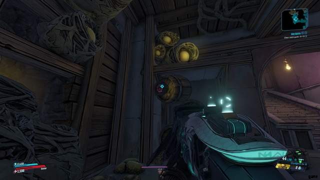 階段の下で右に曲がり、右側の棚にある樽を調べます。樽を赤いマークに向けて撃ち、ラッチ ガンクの最初の部分を破壊します。