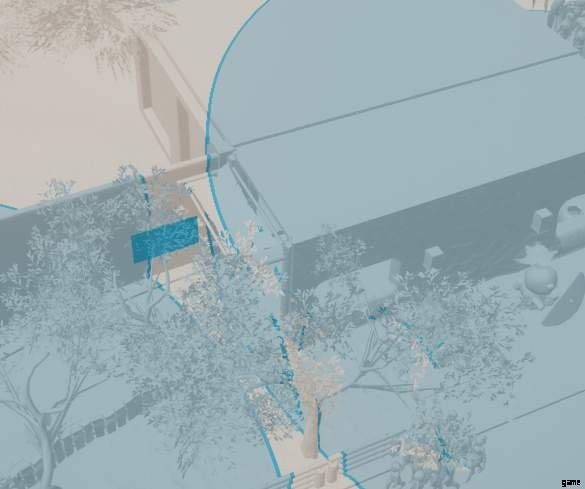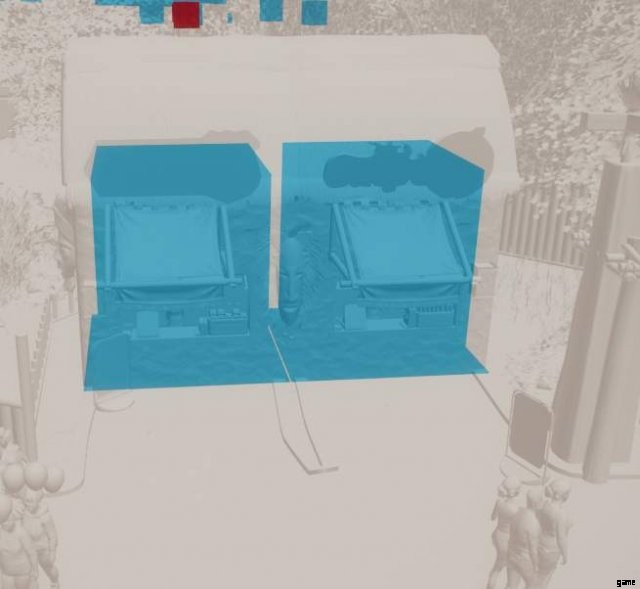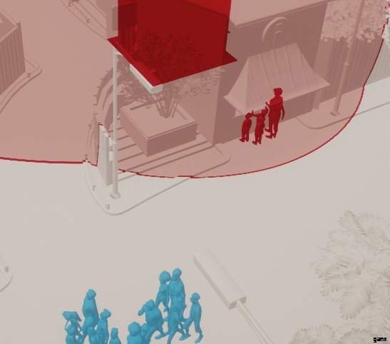 ゲストへの悪影響 (ゲストの幸福度 (青が良い) とスタッフの施設を赤と周囲の半径で表示するため、ゲストがその半径内にいる場合、施設の影響を受けています。
