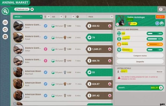 アニマル マーケットは動物が販売されていることを示しており、私の理解では、すべての動物が表示されるサンドボックスを除いて完全にランダムです。価格はドルまたはコンサベーション クレジットと呼ばれる緑の葉で表示され、動物を野生に放すと得られます (またはオフライン モードでは、動物園の評判を改善する必要があります)。