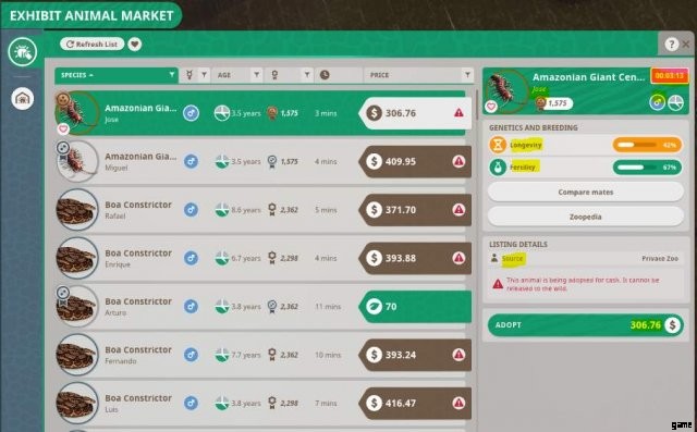 動物を選択すると、その動物の性別、名前、養子縁組、サイズ、寿命、繁殖力、免疫力、星評価、供給元 (動物を購入した場所など) が表示されます。
