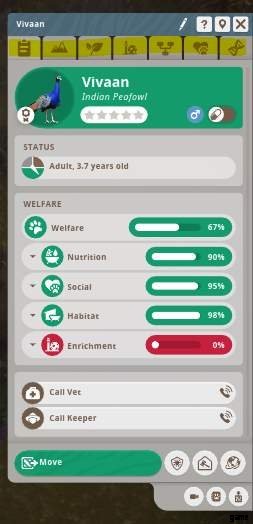 - エンリッチメント (エンリッチメントの福利と、各エンリッチメント オブジェクトが福利にどれだけ貢献しているかを示します。動物のために 100 万個のボールを配置しても、エンリッチメントは向上しません。せいぜい、少しは役に立ちますが、本当に必要なのは各オブジェクト)