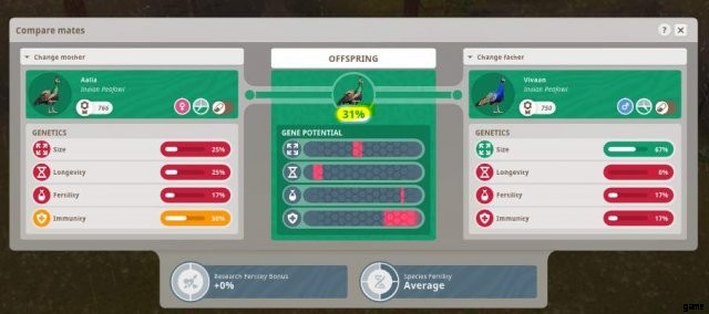動物の遺伝学タブで、繁殖結果メニューが開くボタン比較仲間をクリックできます。これは、左側の母親と右側の将来の父親の 2 匹の動物の繁殖結果の比較をサポートしています。それらを選択すると、中央に予測された遺伝的結果が表示されます。また、受胎率データに基づく受胎率も示しています。