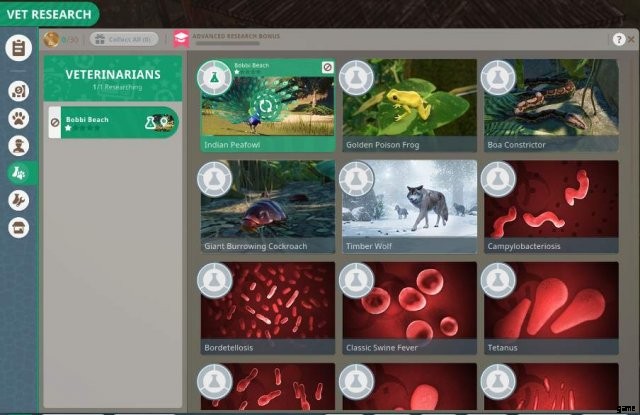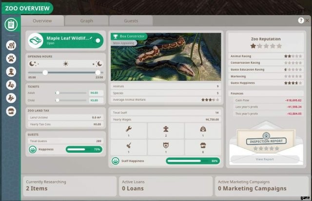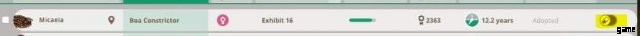 小動物の展示をクリックすると、動物の福祉にアクセスし、(研究した場合) 動物に岩などを提供できるレイアウト タブでエンリッチメントを提供できます。気候タブでは、温度と湿度を調整でき、推奨される温度と湿度が表示されます。窓タブでは、4 つの窓すべてを開閉したり、動物の 2 次元および 3 次元のファサードを作成したりすることもできます。その他のタブは、ログ (維持費を表示) とメンテナンス (作業ゾーンと前回の訪問からの時間を表示) です。