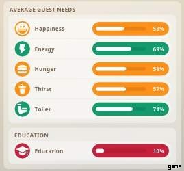 ゲストのニーズ (ゲストのニーズを赤 ((悪い)) と緑 ((良い)) の色で表示します。幸福、エネルギー、空腹、喉の渇き、トイレ、教育などのニーズが必要です。