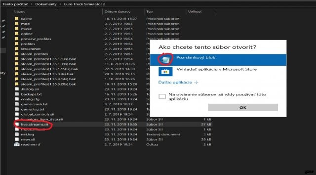 > ドキュメント> Euro Truck Simulator 2> live_streams.sii という名前のファイルを検索し、(任意の) テキスト エディターで開きます。