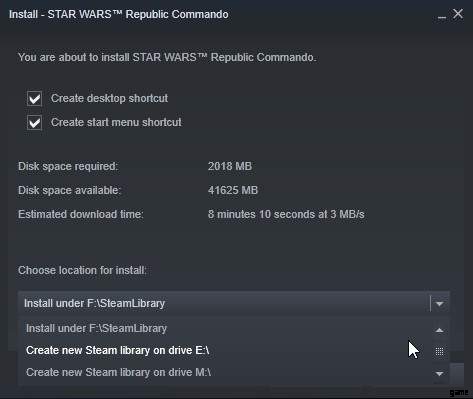 ドロップダウン リストで、優先する SSD (少なくとも 55 GB の容量) を見つけて選択します。そのドライブにまだ Steam ライブラリがない場合は、自動的にそうするオプションが表示されます。安価な SATA SSD を使用している場合、少し苦労するでしょうが、ハード ドライブからこれを実行するよりはましです。