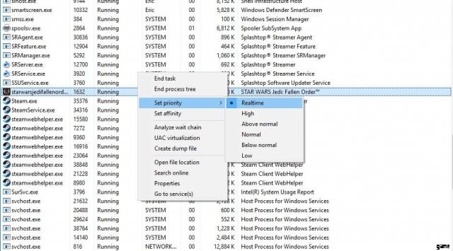 リストでゲームを見つけたら、左クリックで選択してから右クリックし、[優先度を設定] をクリックしてから、[高] または [リアルタイム] を選択します。