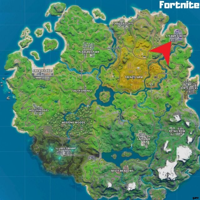 チャプター 2 の新しいマップと座標を相互参照したくない場合は、こちらで対応します。下の画像でわかるように、エリアの南西の角にある紫色の立方体の前にある Steamy Stacks に XP のドロップ場所があります。