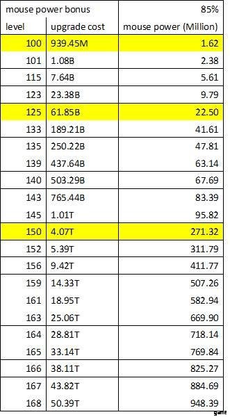 マウスパワーとスパイラルパワーはレベル145以降(兆単位)に高価なので、マウスパワーをアップグレードするだけで十分です(真珠の養殖)。