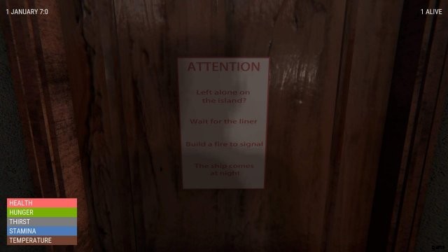 毎晩あなたを救助する船は、島の 4 つの側面にある別の道を進んでいます。あなたがしなければならないことは、その道に沿って大きな火(8本以上の棒)を作らなければならないということです.あなたがビーチにいることを確認してください!救出されると、クルーズ船が花火/フレアを放ち、「[プレイヤー名] が島を離れました!」と言って、勝利画面を促します。