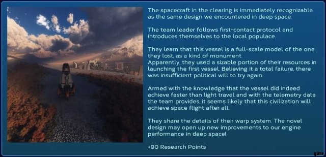 - 旅行中すぐに、閃光が見え、将校は「ワープの幾何学的形状がスケールから外れました」と気付くでしょう。損傷した小さなワープ船が到着しました。それを調査すると、クエスト「Primitive Vessel」が与えられます:それを発射した惑星を見つけること(クエストターゲットマーカーなし)。惑星を見つけて着陸すると、ボイド移動速度に関する追加の技術研究ポイントが 3 つ得られます。