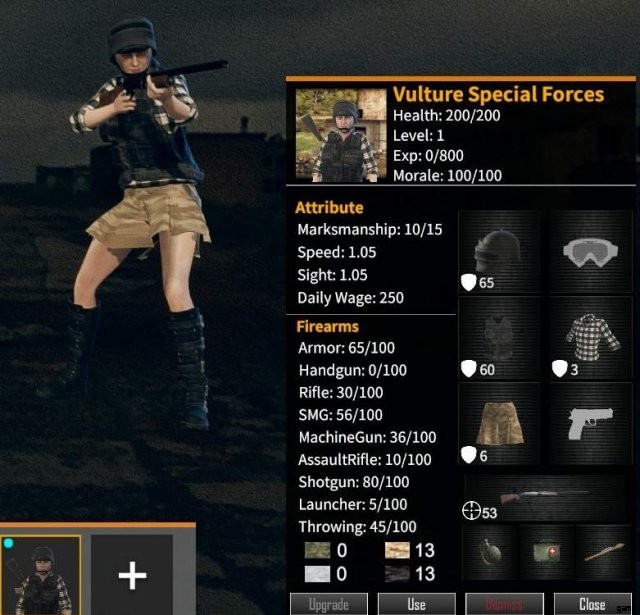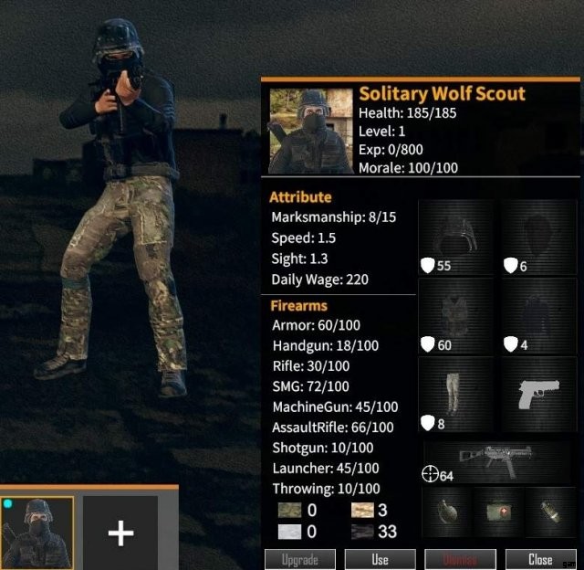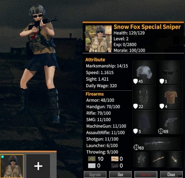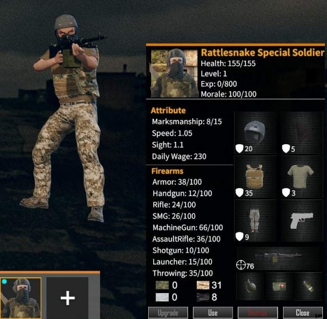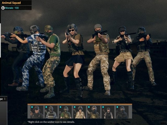 - 彼女は RPG を持っていますが、ランチャー スキルを持っていません。投げられた手榴弾と比較して精度やダメージのボーナスがないため、それを置き換えるのが最善です.ショットガン部隊は夜間戦闘が得意なので、RPG を NVG に置き換えます。日中、混成部隊の一員であれば、代わりにスモーク グレネードを使用します。