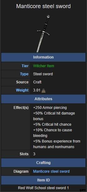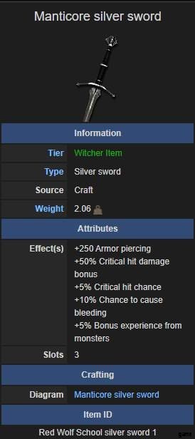 ウィッチャー 3:ワイルド ハント – マンティコア装備統計のまとめ