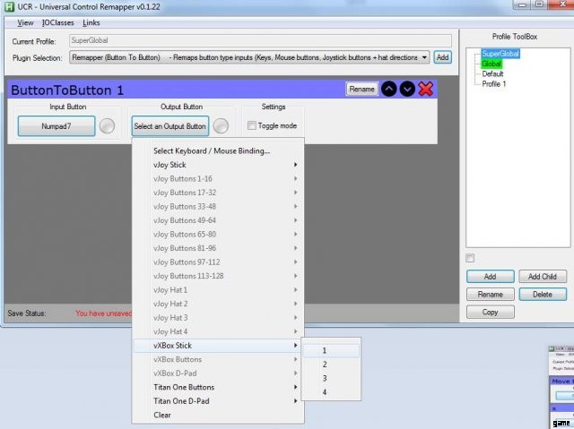 出力ボタンをバインドするには、vXBox スティック => 1/2/3/4 に移動します (関係ありませんが、複数のキーをバインドする場合は、1 つの数字にバインドします)。