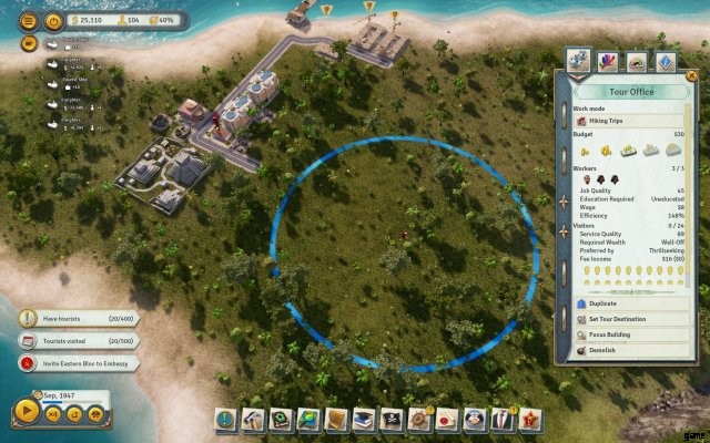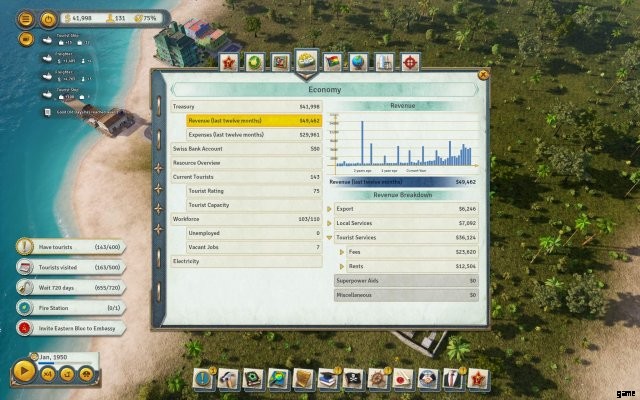 ツーリスト ドックが「エコノミー ライナー」に設定されている場合、裕福なツーリストのみが到着します。 「豪華客船」にすればリッチな観光客しか来ないから妥協なし。金持ちの観光客向けの宿泊施設やアトラクションを建設しても、裕福な観光客だけが島に到着できるとしたら、現金をトイレに流してしまうことになります。