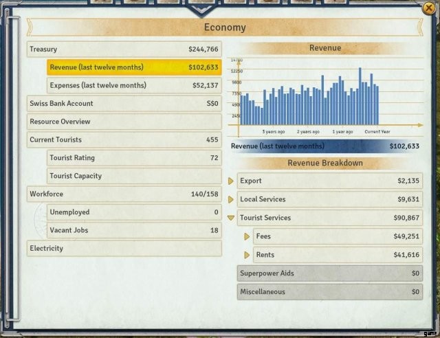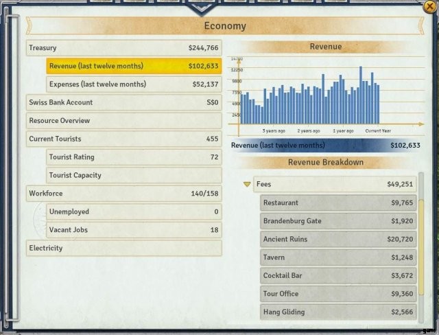 このウォークスルーでは、観光の可能性のほんの一部しか探究していません。なぜなら、教育を受けていない裕福な観光客と、電気を必要とせず、ほとんどが冷戦時代の労働者を使用するサービスに専念しているためです。このアプローチはおそらく最高の投資収益率と利益率を提供しますが、このアプローチに従えば、他の観光客の富レベルを試すための現金が不足することはありません.