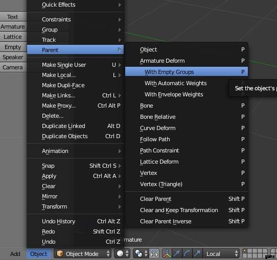 次に、アーマチュアを空のグループ (自動ウェイトではない) を持つモデルにペアレント化します