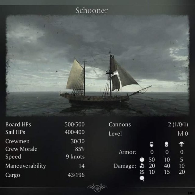 この船は、機能面でアップグレードされたスクーナーと考えることができます。これは、より強力な機能を搭載しつつ、速度と機動性のボーナスを維持しているためです。戦闘中の敵船が頻繁に逃げる場合は、この機敏な船で敵を追跡することを検討する必要があります。この船の基本コストは 10,000R で、セント ジョージの「ジャック ド ラ クロワ」から購入できます。