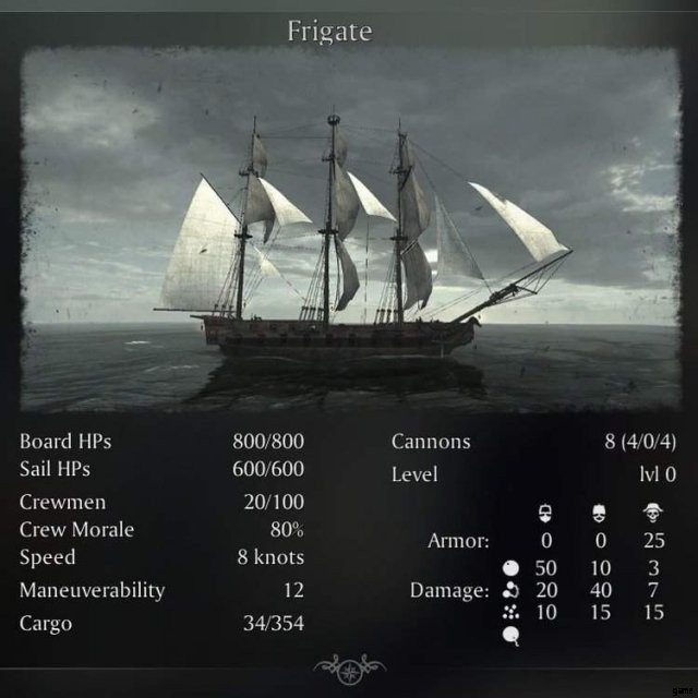 これは、すべての船の「マリオ」であり、速度と機動性を維持しながら、大砲の配列、乗組員の小さな軍隊を誇っていることでバランスが取れています。この船は、3 ~ 4 隻の小型船との交戦においても、事実上無敵です。船長は、この船は真に経験豊富な海賊専用であることに注意してください.この船の基本コストは 25,000R です (この船は帆のヘルスが 0 で船体のヘルスが非常に低いため、購入時に修理する必要があります)、ポート ロワイヤルの「ハンフリー スコットソン」から購入できます。