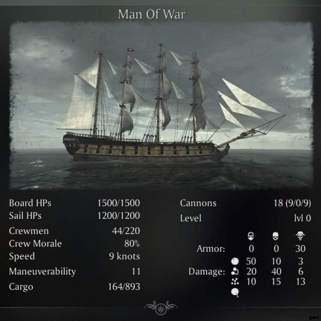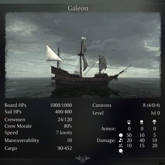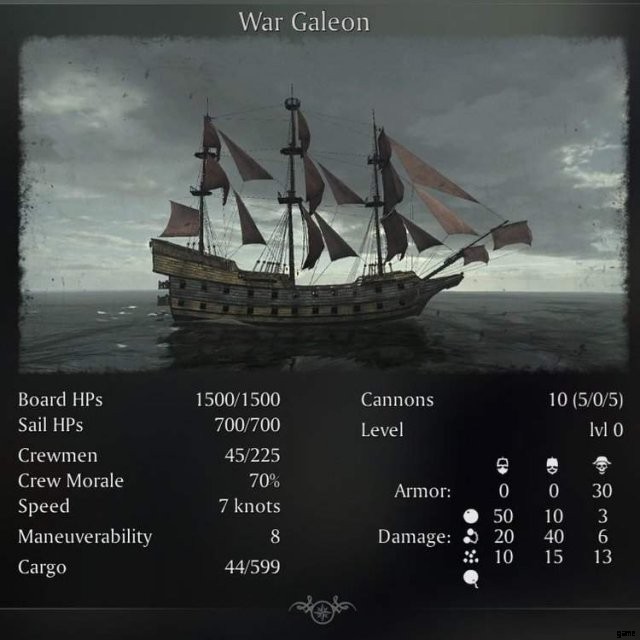 この船は貿易ガレオンの戦闘バージョンです。それは、より多くのより大きな口径の銃と寝台のために、乗組員に対するその大きな保有率を交換します。この船の主砲の数をアップグレードすると、狙いを定めたいくつかの舷側砲で敵を平準化できます。この船の基本コストは 20,000R で、サンファンの「フアン マノ」から購入できます。