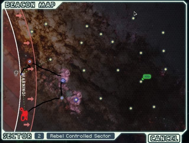 次の目標は、できるだけ多くの救難ビーコンとストア ビーコンの機会を確保すること (ストアを探している場合)、または長距離スキャナーを持っている場合は船の戦いを行うことです。反乱軍の艦隊の先を行くことで、到達するのに余分なジャンプが必要な邪魔にならない場所にある場合に備えて、クエスト ビーコンに簡単にアクセスできる場合もあります。また、ここの星雲ビーコンは、考慮されているすべてのものを訪れるには魅力的ではないように見えます.追加のビーコンが訪問されることにはならず、適切なパスには役に立たない場所にあります。