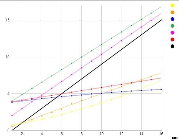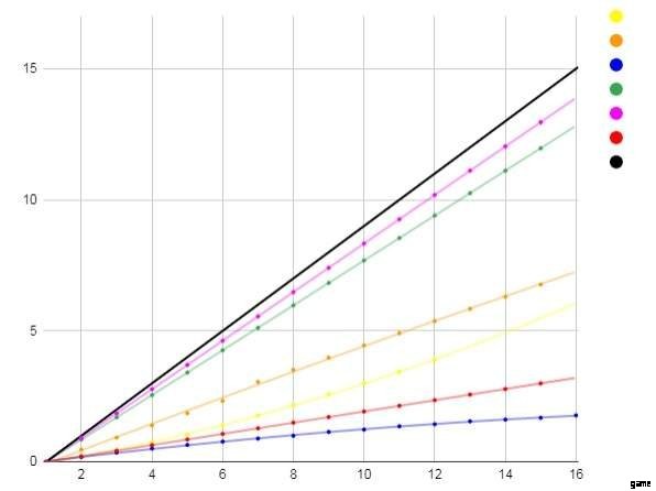 一部の魔法使いは、異なる色のパワーを比較しようとして、各宝石のパワーと等級を示すプロットを描きたいと思うかもしれません.