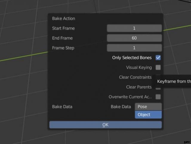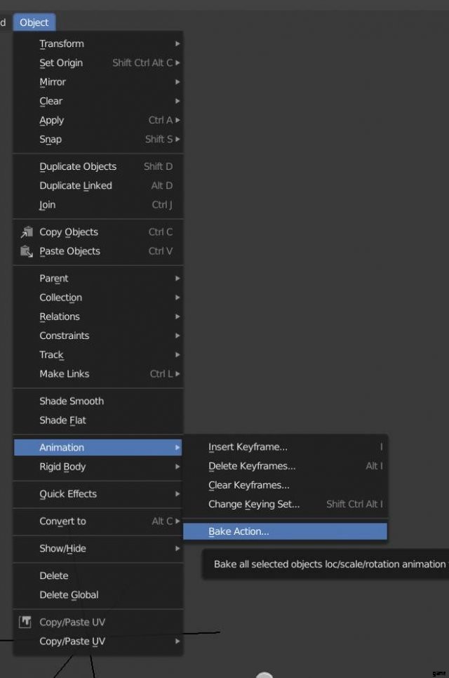 ヒント: 最初のオブジェクトが最後にあるすべてのオブジェクトを選択してアクティブにします。次に、オブジェクトをヒット -> アニメーション -> アクションをベイク….